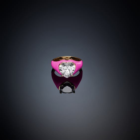 Anello placcato oro giallo, con smalto a fuoco rosa intenso e pietra cubic zirconia a forma di cuore.