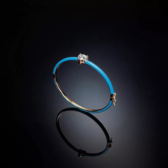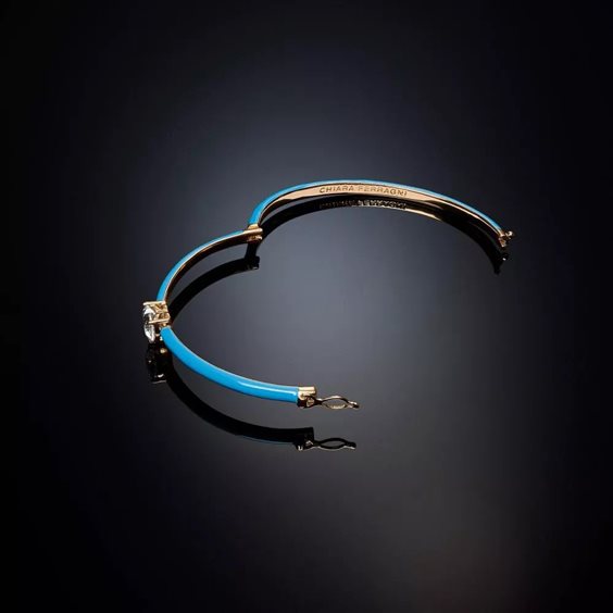 Bracciale rigido diametro di 5.5 cm con smalto azzurro fucsia zircone a cuore incastonato con base dorata. chiusura laterale con gancio di sicurezza.
