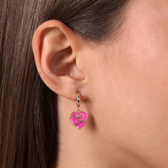 Orecchini a cerchietto e cuoricino con smalto rosa e scritta True Love