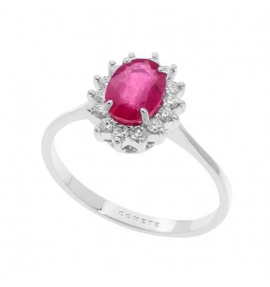 Anello in oro bianco 18 kt della collezione Regina. Rubino ovale di carati 1,20 contornata di diamanti di carati 0,21. Colore: G Purezza: Si Tempi di evasione d’ordine in 2/6 giorni.