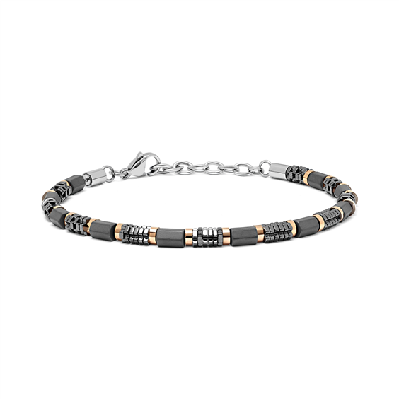 Bracciale in acciaio lucido con trattamento in PVD nero e rosé e pietra ematite. Lunghezza regolabile.
