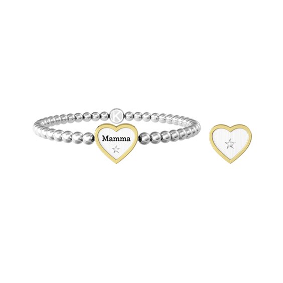 Bracciale elastico in acciaio 316L, circonferenza 17.5 cm, con sfere lucide e ciondolo satinato taglio cuore, bordo PVD giallo, cristallo bianco. Scritta: Mamma. Dimensioni: ciondolo Ø 13.5x12 mm, sfere Ø 4 mm, cristallo Ø 1.75 mm