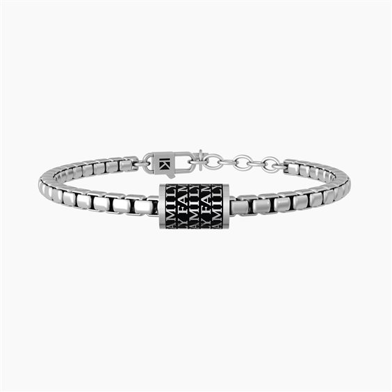 Bracciale in acciaio 316L satinato, lunghezza regolabile da 19 a 21 cm con catena veneta e rondella con PVD Nero. Scritta: FAMILY Dimensioni: catena 4 mm, rondella 13x8.5 mm.
