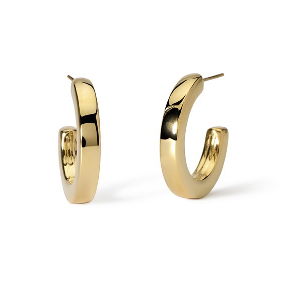 Orecchini a cerchio piatti in acciaio dorato. • Diametro esterno: 29 mm • Diametro interno: 19,5 mm • Materiale: Acciaio 316L, Acciaio 304