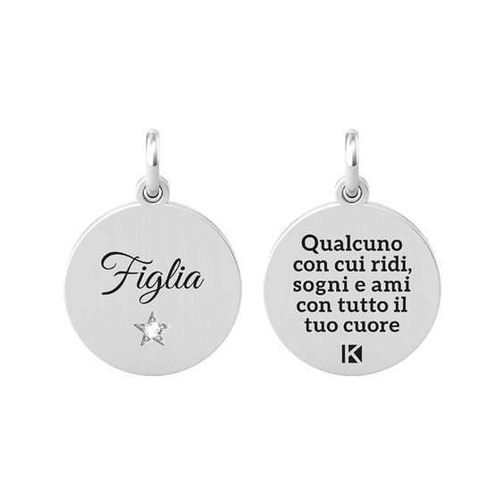Ciondolo in acciaio 316L satinato con cristallo bianco. Scritta: Figlia Qualcuno con... cuore. Dimensioni: ciondolo Ø 15 mm, cristallo Ø 1.2 mm