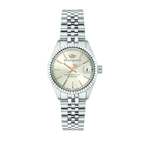 Collezione Caribe: movimento al quarzo Swiss Made Ronda 505, cassa in acciaio inox mm.31, vetro zaffiro con lente, impermeabilità 10atm., bracciale jubilee in acciaio, quadrante argento con dettagli in oro rosa.