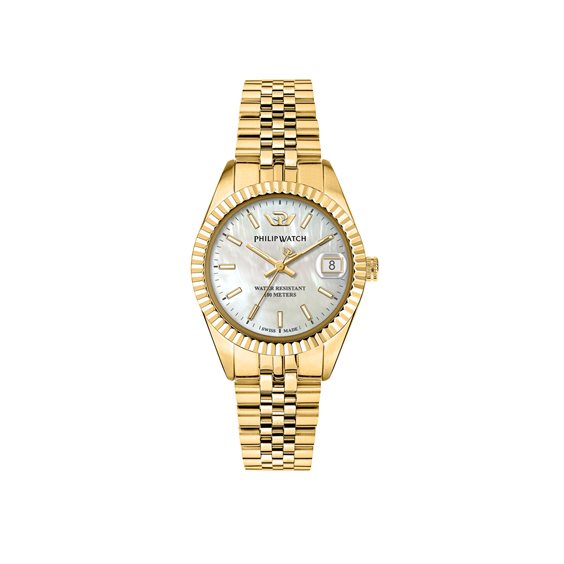 Orologio Philip Watch donna Funzione solo tempo con data Cassa in acciaio pvd oro di 28 mm Quadrante in madreperla bianca con indici a bastone colo oro, lunetta zigrinata Vetro con trattamento zaffiro Cinturino in acciaio pvd oro Impermeabilità fino a 10 atm
