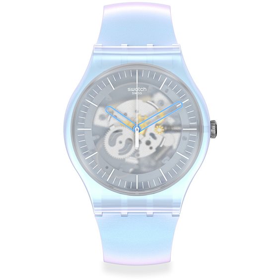 Orologio Solo Tempo Unisex Di Swatch Della Collezione Monthly Drop. Orologio Con Cassa In Plastica Di Colore Azzurro Semi-Trasparente Con Effetto Iridescente E Di Forma Rotonda, Diametro Della Cassa Di 41 Mm. Cinturino In Silicone Strutturato Di Colore Azzurro Semi-Trasparente Con Effetto Iridescente. Larghezza Delle Anse Di 19 Mm E La Resistenza All'Acqua È Di 3 Bar.Il Movimento È Al Quarzo